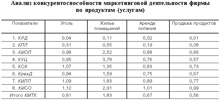 Точно таким же образом проведены расчеты конкурентоспособности продуктов (услуг) — продажа жилья, аренда помещений, продажа продуктов питания. Данные также внесены в таблицу 1.