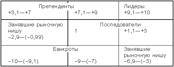 Матрица представляет собой прямоугольник, разбитый на девять квадрантов (секторов), каждый из которых соответствует определенному коэффициенту от –10 до 10. Сам прямоугольник делится на пять уровней, каждый из которых соответствует определенной группе фирм, различающихся между собой уровнем конкурентоспособности и относящихся к следующим группам участников рынка: