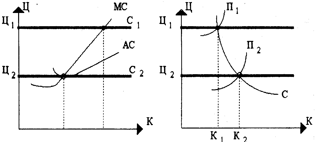 Это означает, что на краткосрочном интервале времени превышение равновесной цены приведет к перепроизводству и созданию излишков продукции , а занижение цены - к созданию дефицита. Однако, поскольку «вход» и «выход» из отрасли никак не ограничен, экономическая прибыль(убытки) в долгосрочном периоде для большинства предприятий сведется к нулю (рис.1б). Это произойдет из-за того, что цена установится на равновесном уровне Ц>0>, для которого объем товара, нашедшего спрос, будет равен объему товара, предложенного потребителям К>0>. В результате продавцы товаров будут довольствоваться только нормальной прибылью, удерживающей предпринимателя в данном бизнесе. При этом на рынке совершенной конкуренции останутся те предприятия, величина издержек которых позволяет получать нормальную прибыль при равновесной цене Ц>0>.