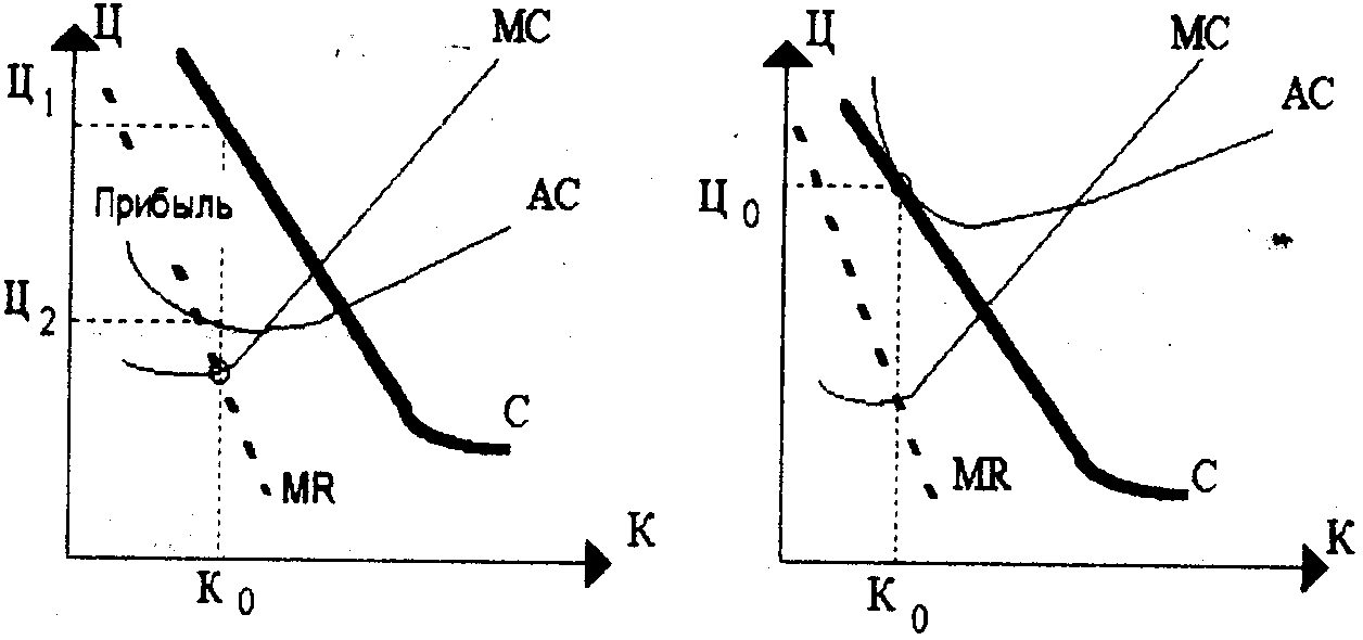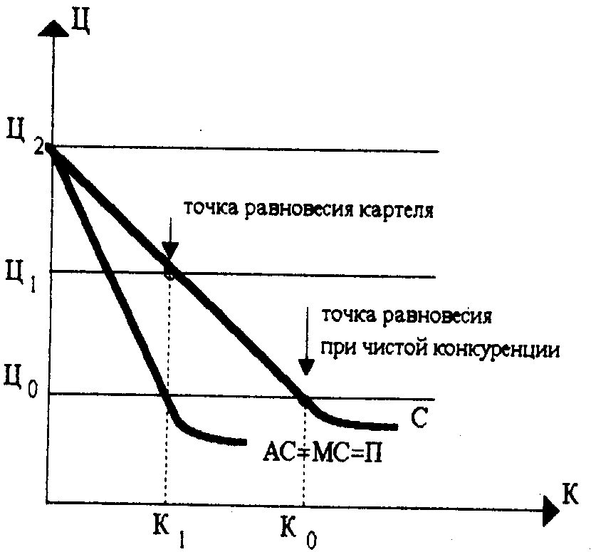 Если предположить, что данные предприятия договорились о сотрудничестве, то общее руководство будет рассуждать как монополист. В связи с тем, что максимальная прибыль монополиста достигается при таком выпуске, когда предельные издержки равны предельному доходу, объем выпуска олигополии вероятнее всего сократится до К>1> и цена будет повышена до Ц>1>. Для каждого предприятия будут установлены квоты реализации, в сумме составляющие К>1>, что естественно меньше первоначального объема К>0>. Таким образом, даже относительно небольшие предприятия могут пользоваться преимуществами чистой монополии. Принято считать, что если в условиях олигополии предприятия получают прибыль, превышающие альтернативную стоимость, они ведут себя как чистая монополия, в противном случае, как предприятия, работающие на рынке монополистической конкуренции.