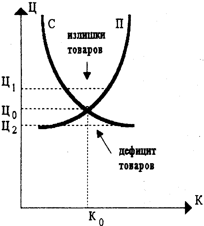В условиях чистой конкуренции, когда ни один продавец не в состоянии оказывать заметного влияние на формирование цены спроса, равновесная цена(Ц>0>) определяется совокупным спросом (С) и совокупным предложением (П) товара на рынке (рис.1а).[6]