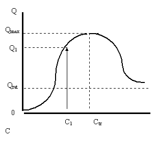 Рисунок 1. Кривая зависимости объема потребления Q от величины дохода С при фиксированной цене