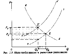 Направления движения цены и объемы производства товаров показаны стрелками вдоль соответствующих осей графика. Налог платит непосредственно производитель или продавец товаров, однако большая его часть перекладывается на потребителей, покупающих облагаемые налогом товары. Размер уплачиваемого государству налога равняется заштрихованному на графике участку. Это вычет из торговой выручки продавца и одновременно вычет из личных доходов потребителей, покупающих облагаемые налогом товары. Но главный отрицательный эффект налогообложения – общее снижение производства товаров и недопотребление их покупателями, для которых этот товар оказался недоступным.