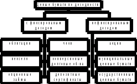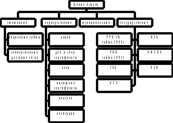Следует отметить, что практически все рынки находят отражение в инструментах рынка ценных бумаг. Так, например, рынок вновь произведенной продукции и услуг представлен коносаментами, товарными фьючерсами и опционами, коммерческими векселями; рынок земли и природных ресурсов - закладными листами, акциями, облигациями, обеспечением которых служат земельные ресурсы и т.д.