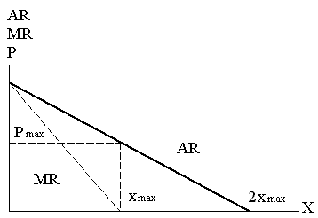 Точка максимальной выручки, как и в случае совершенной конкуренции, определяется положением, при котором предельная выручка (МR) равна нулю, т.е. суммарная выручка (TR) перестает расти. На графике это точка x>max>, т.е. место, где кривая МR пересекает нулевую горизонтальную ось. Ниже этой оси МR приобретает отрицательные значения, т.е. TR начинает убывать.