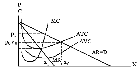 Разумеется, прибыль образуется только тогда, когда цена превышает средние полные издержки (р>АТС), что соответствует точке пересечения кривых полных издержек и спроса. При совершенной конкуренции именно в этой точке образуется рыночное равновесие, т.е. равновесной цене р>0> соответствует равновесное предложение x>0>. При совершенной конкуренции фирма, как правило, не может получить цену большую, чем равновесная. Монополия же имеет такую возможность, причем образуется целая зона (от x>0 >до х>1>), где реализуется монопольная сверхприбыль.