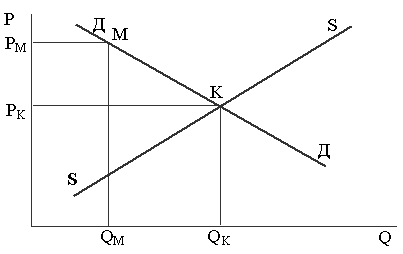 Графически рыночное равновесие определяется точкой пересечения кривых спроса Д-Д и предложения S-S. В условиях свободной конкуренции рыночная (равновесная) цена является конкурентной. Свободная конкуренция предполагает такое (достаточно) большое количество продавцов и покупателей, чтобы ни один из них не мог оказать существенное влияние на уровень рыночной цены. Важно отметить, что кривые спроса Д-Д и предложения S-S складываются соответственно из кривых спроса и кривых предложения отдельных хозяйствующих субъектов. При монополизации рынка ситуация существенно изменяется.
