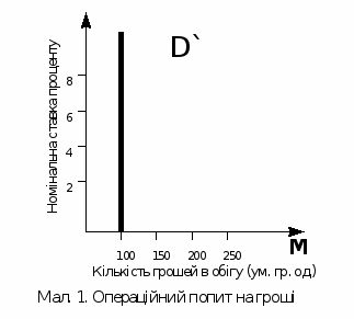 Попит на гроші як засіб обігу визначається рівнем грошового чи номiнального ВНП (прямо пропорційно). Чим більше прибуток в суспільстві, чим більше укладається угод, чим вище рівень цін, тим більше буде потрібно грошей для укладення економічних угод в рамках національної економіки. З певним спрощенням можна сказати, що операційний попит на гроші не залежить від ставки проценту, при цьому графік попиту має вигляд як на мал.1.