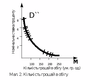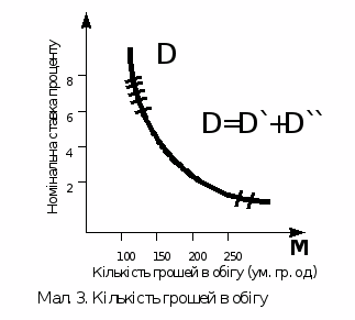 На мал. 3: номiнальна процентна ставка - на вертикальній осі, загальний попит на гроші - на горизонтальній осі. Функціональна залежність цих параметрів дає сукупність кривих, кожна з яких відповідає певному рівню номiнального ВНП. Переміщення уздовж кривої показують зміни процентної ставки. Причому спостержемо, що при високих процентних ставках крива стає майже вертикальною, оскільки всі заощадження укладаються в цій ситуації в цінні папери, попит на гроші обмежується операційним попитом і вже не знижується при подальшому зростанні проценту.