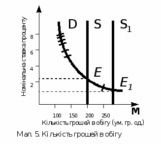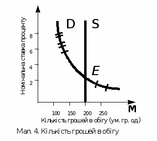 В цілому грошовий ринок може бути представлений в вигляді графіку (мал 4). S - пропозиція грошей - представлено у вигляді вертикальної прямої, оскільки припускає, що грошово-кредитні і фінансові заклади створили певну кількість грошей, що не залежить від величини номiнальної ставки проценту. Крапка Е - знаходиться на перетині кривих попиту і пропозиції грошей і визначає «ціну» рівноваги на грошовому ринку.