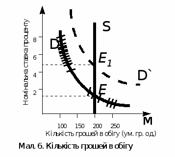 Які реальні процеси iлюструє мал. 5? При збільшенні пропозиції грошей виникає їх короткочасний надлишок. Люди прагнуть зменшити кількість своїх грошових запасів шляхом покупки інших фінансових активів (наприклад, облігацій). Попит на них зростає, ціни, відповідно, збільшуються. Процентна ставка, чи альтернативна вартість зберігання не приносящих відсотків грошей, падає. Оскільки ликвiдність стає меньш дорогою, населення і фірми поступово збільшують кількість готівки і чекових вкладів, що вони готові держати на руках, і відбудовується рівновага на грошовому ринку при більшій пропозиції грошей і меншому проценті.