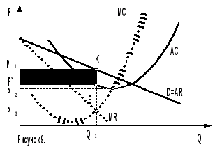 Из рисунка 9 ясно следует, что в отличие от чистой конкуренции фирма действующая в условиях чистой монополии при тех же издержках достигнет намного менее желательных результатов. Чистый монополист будет максимизировать прибыль, производя объем продукции Q>1> и назначая цену P>1>. Можно увидеть, что монополист сочтет выгодным продавать меньший объем продукции, но по большей цене, чего не сделал бы конкурирующий производитель. Максимизирующий прибыль объем продукции монополиста приводит к недораспределению ресурсов (при объеме Q>1> по рисунку 9 Р>1> > Р>3> = MC); монополист считает выгодным ограничение объема и, следовательно, использование меньшего количества ресурсов, чем оправдано с точки зрения общества. Кроме этого, учитывая то, что монополист получает экономическую прибыль даже в длительном периоде, минимальное значение средних общих издержек не совпадает с ценой, по которой он реализует продукцию (Р>1> > Р>2> = AC). Таким образом, не выполняется ни условие (13) ни (14). Ни производственная эффективность, ни эффективность размещения ресурсов недостижимы на монополистических рынках.