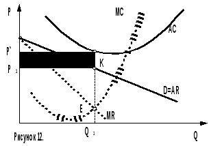 Фирма, производя выпуск объема Q1 и назначая цену P1 способна получить монопольную прибыль, если конечно P1>P` (Рисунок 9.). В этом случае ее прибыль характеризуется закрашенным прямоугольником (как и в противном случае (Рисунок 12.) может нести убытки, которые она способно минимизировать в соответствии с той же формулой (10). В этом случае P1<P`).