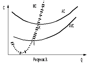 В точках E и K достигаются минимальные значения средних переменных и средних общих издержек соответственно. Это можно объяснить логически. Представим себе, что предельные издержки выше общих средних на каком-то интервале значений выпуска продукции. Это означает, что приращение общих издержек, вызванное увеличением производства на единицу продукции будет выше средних, т.е. средние издержки возрастают. И наоборот предельные издержки ниже общих средних то убывают.