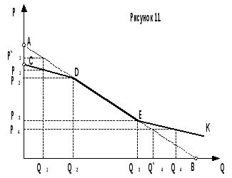 Производитель чувствует себя монополистом лишь на отрезке Q2Q3. Если он решит снизить объем до Q1, с тем, чтобы цена была P`1, часть покупателей уйдет к конкурентам и цена установится на уровне P1. Соответственно при установлении низкой цены P4 производитель рассчитывает производить Q`4, однако его конкуренты тоже снизили цену и ему приходится увеличить объем до Q4 [3].