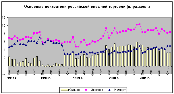 В ноябре 2001 г. по сравнению с предыдущим месяцем экспорт вырос на 2,4%. Но в то же время по сравнению с уровнем годовой давности произошло заметное сокращение экспортных поставок - на 17,6%. За последние 29 месяцев это наиболее низкий показатель. В ноябре экспорт составил 8,4 млрд. долл. против 8,2 млрд. долл. в октябре и 10,2 млрд. долл. в ноябре прошлого года.