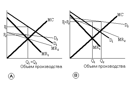Изменение спроса обычно вызывает изменения как цены, так и объема выпуска продукции. Но особые случаи, приведенные на рис.2, показывают важное различие между монопольным и конкурентным предложением. Отрасль с конкурирующими производителями предлагает определенное количество продукции по каждой цене. Такой взаимосвязи нет для монополиста, который в зависимости от того, как изменится спрос, может предлагать разное количество продукции по одной и той же цене или одинаковое количество по разным ценам.