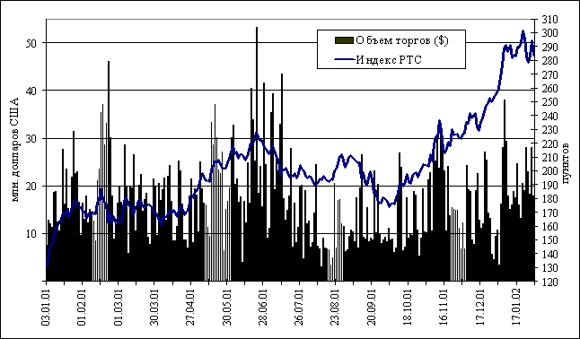 В январе на российском рынке акций продолжился повышательный тренд. С 29 декабря по 30 января рост индекса РТС составил на 23.63 пункта (9.09%), оборот превысил $405 млн., что более чем на 40% выше аналогичного показателя предыдущего месяца. 8 января дневной оборот достиг полугодового максимума – $37.9 млн(Последний раз объём торгов превышал данное значение 12 июля 2001 года.). Среднедневной объем торгов в РТС составил $21.4 млн. В первую декаду месяца наблюдался бурный рост индекса РТС (с 29 декабря по 9 января фондовый индикатор вырос на 11.8%). Максимальный дневной рост был зафиксирован 8 января и составил 4.3%. Далее индекс также демонстрировал активный рост и 22 января достиг очередного исторического максимума – 301.45 пункта. (Последний раз индекс РТС превышал отметку 300 пунктов 08 мая 1998 года.) Однако в конце месяца индекс не смог удержать достигнутых высот: после рекордного повышения произошло стремительное падение. 25 января снижение (по сравнению с максимумом) составило 23.11 пункта (-7.6%).