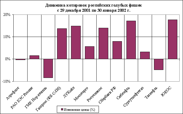 Лидерами повышения среди “голубых фишек” (на 30 января) стали акции “Юкоса” (17.67%) и “Сибнефти” (17.13%), за ними последовали: “Лукойл” (14.84%), “Ростелеком” (14.05%) и “Сбербанк” (8.0%). Замыкают список акции “Аэрофлота” (-0.28%), “Татнефти” (-4.78%) и ГМК “Норильский Никель” (-8.36%).