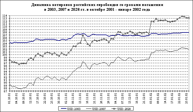 В январе 2002 года котировки всех российских ценных бумаг резко выросли (см. рисунки 1 и 2). В частности, доходность к погашению по ОВВЗ опустилась с 10–13% до 7,5–12% годовых, а по еврооблигациям – до 4,7–11% годовых. На наш взгляд, такой рост цен российских долговых обязательств объясняется преимущественно ростом спроса на них со стороны международных инвестиционных фондов. Устойчивость экономической ситуации в России, высокие показатели роста экономики на фоне снижающихся темпов роста в мире, снижение вероятности дефолта по внешнему долгу позволили инвесторам пересмотреть лимиты на российские ценные бумаги в сторону повышения. Принимая во внимание текущий суверенный рейтинг России и сохраняющуюся неопределенность на нефтяном рынке и на развивающихся финансовых рынках, мы предполагаем, что рост котировок закончится в ближайшее время, и уже в феврале можно ожидать некоторой коррекции.