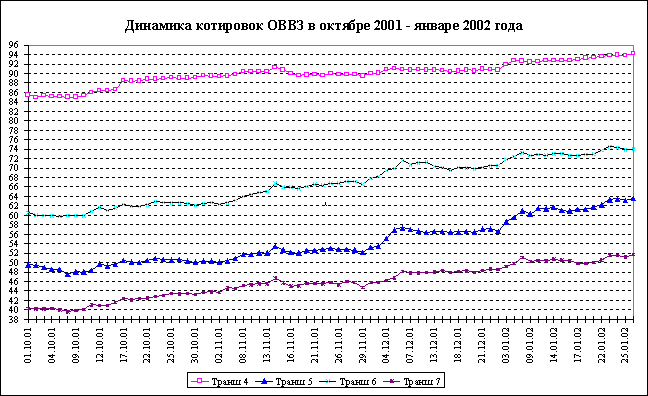 Подводя итоги 2001 года, можно отметить, что на рынке внешних долговых обязательств России наблюдалась четко выраженная тенденция к снижению доходности по всем видам ценных бумаг. Наиболее показательным в этом отношении было снижение доходности по ОВВЗ: в частности, доходность 4 транша (погашение в мае 2003 года) за год снизилась с 32% до 10% годовых, доходность еврооблигаций с погашением в 2003 году понизилась с 15% до 6,5% годовых. Таким образом, диапазон ставок по российским государственным валютным облигациям в 2001 году сузился с 11–32% до 5–13% годовых, цены российских валютных облигаций достигли исторически максимальных значений.