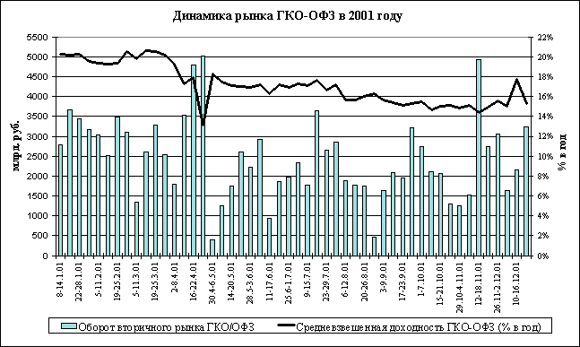 На рынке внутреннего долга РФ в 2001 году наблюдалось плавное снижение уровня доходности облигаций при сохранении относительно низких объемов торгов (см. рисунок 3). В целом за год средневзвешенная доходность ГКО-ОФЗ к погашению опустилась с 20% до 14–15% годовых. Средний недельный объем торгов составил около 2–2,5 млрд. рублей. На протяжении всего года реальная доходность ГКО-ОФЗ к погашению оставалась отрицательной, и спрос на данные ценные бумаги был низок.