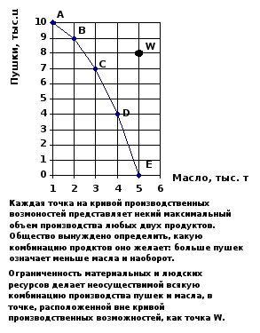 Становится очевидным, что экономика сталкивается с необходимостью выбора между альтернативами? При всей безграничности потребностей, объем имеющихся ресурсов, которые могут быть направлены на производство того или иного продукта, ограничен. Данное положение можно проиллюстрировать на кривой производственных возможностей классическим примером распределения ресурсов, направляемых на производство пушек и масла, при допущении полной занятости ресурсов.