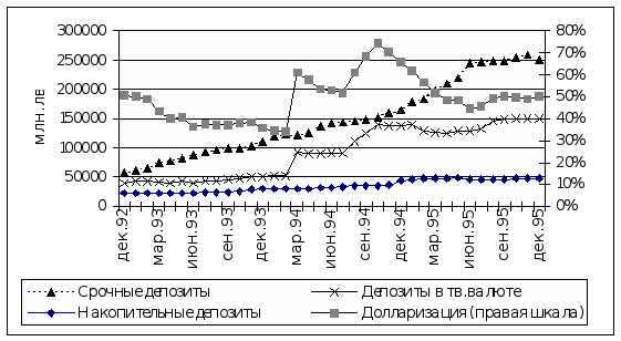Значительную роль в стабилизации валютного курса сыграло состояние валютного резерва, который в 1995г. заметно возрос с 899 млн.долл. в январе до уровня 1,25 млрд.долл. в начале 1996г. (см.рис.3-2).