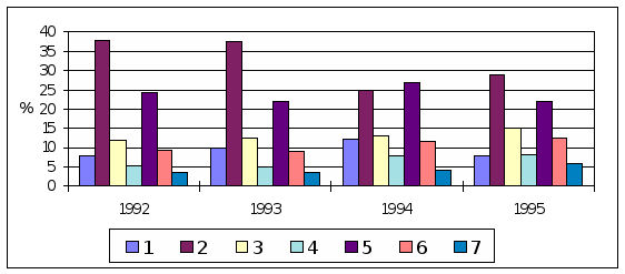 Структура ВВП по элементам конечного пользования в последние 7 лет характерна для регрессивной экономики с незначительным уровнем накопления долгосрочных активов (см. табл.1-7). Если же к снижению в 3,6 раза относительной доли накопления долгосрочных активов прибавить его примитивную структуру, ограниченную направленность и низкий технологический уровень, то картина становится ещё более тревожной: