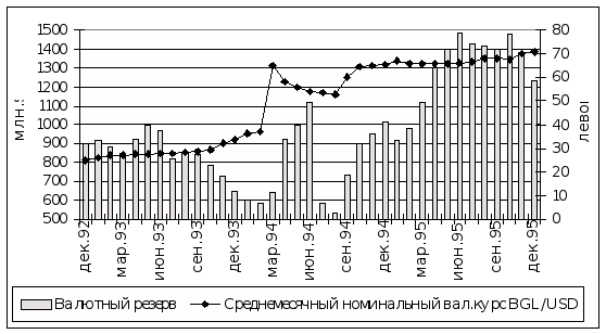 Несмотря на то, что в 1995г. БНБ накапливал резервы с оглядкой на обслуживание внешнего долга, немалая доля этого резерва была предназначена для поддержания своей политики на валютном рынке. Это особенно заметно в конце года, когда БНБ был вынужден активно реализовывать твердую валюту, чтобы не допустить резкого обесценивания лева (см.рис.1-3).