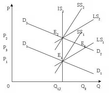 Кейнсианский отрезок (I) соответствует спаду в экономике, которому присуща безработица; материальные ресурсы также используются не на полную мощность. В таких условиях можно расширить производство без увеличения издержек на единицу продукции и повышения цен, так как вовлекаются незагруженное оборудование и незанятая рабочая сила.
