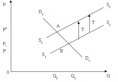 Действительно, если ранее покупатели согласны были приобрести количества товара Q>1> при цене Р>1>, то теперь они согласятся приобрести то же количество товара, если только его цена без налога будет на Т руб. ниже. Тогда покупатели заплатят цену с включением налога, равную прежней цене.