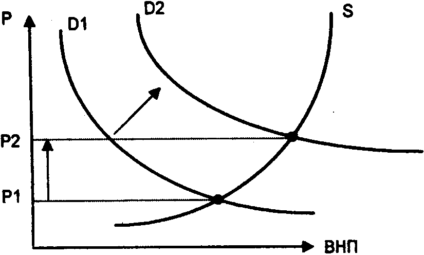 Допустим, что экономика близка к полной занятости и загруженности производственных мощностей. Рост расходов населения, предприятий, государства на потребление смещает кривую совокупного спроса вверх, растут цены (рис. 2).