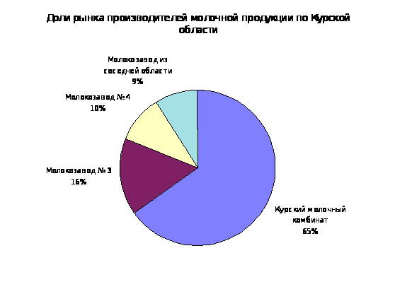 Из методов борьбы мы выбираем ценовую политику. Как мы помним, благодаря закупкам новых линий, мы в состоянии опускать цены в среднем на 13-24%, благодаря снижению себестоимости только по переработке и выпуску продукции. При возрастающих ценах на бензин, с нашего рынка должен уйти частично или полностью молокозавод из соседней области, который будет не в состоянии опускать цены из-за высоких постоянных затрат (затраты на горючее). У нас останутся только три мелких конкурента, из которых жизнеспособных только два. В сумме они занимаю. Вот как должен выглядеть график долей рынка через год.