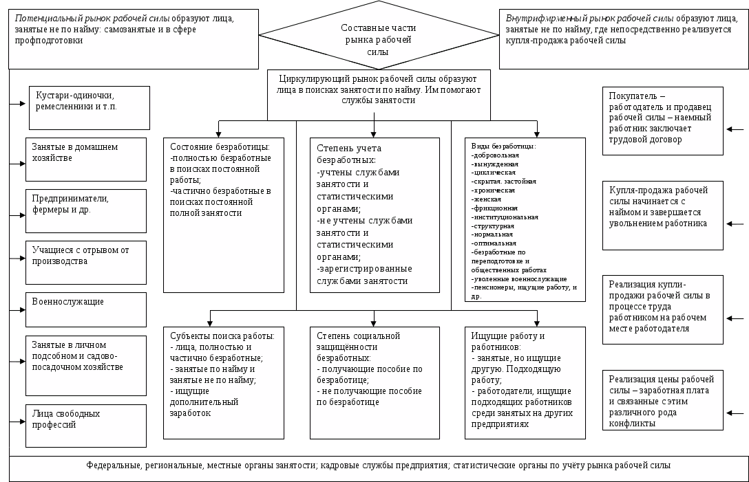 Все эти лица имеют неодинаковое отношение к рынку рабочей силы, хотя в совокупности они и образуют его потенциальную часть. Экономическая функция этой части рынка рабочей силы заключается в том, что здесь лишь формируется наёмный труд экономически и профессионально. В каждый данный момент какая-то часть наёмного труда находится в состоянии перерыва между выходом из одних и включением в другие части рынка труда. Такой перерыв как раз и есть то время, когда работники предлагают свою рабочую силу, в поисках покупателя непрерывно перемещаясь, циркулируя между предприятиями. Здесь рабочая сила, как и любой другой товар, циркулирует в качестве товара, а продавец этого товара постоянно перемещается между предприятиями в поисках покупателя. Эту сферу предложения к продаже рабочей силы мы и называем открытым, циркулирующим рынком рабочей силы, но где ещё отсутствует акт её купли-продажи. Основной критерий, кого нужно относить к открытой. Циркулирующей части рынка рабочей силы, - это поиск подходящего места работы и обращение по этому вопросу в службы занятости и непосредственно в отделы кадров предприятий. (схема 3) Внутрифирменный рынок рабочей силы тоже называется по-разному: скрытым, внутренним. Реальный процесс купли-продажи рабочей силы и реализация её цены происходят не за воротами фирмы и не в точке соприкосновения циркулирующей и внутрифирменной частей рынка рабочей силы в виде трудового договора, а внутри фирмы. Именно здесь предложение рабочей силы и спор на неё соединяются, практически реализуясь в виде купли-продажи и цены этого товара. Именно здесь находится самая важная составная часть рынка рабочей силы, её внутрифирменный рынок, в котором находят своё завершение потенциальная и циркулирующая части. Наглядное представление о составных частях рынка рабочей силы даёт схема 4 Вместе с тем в жизни мы встречаемся с такими понятиями, как «городской рынок труда», «женский рынок труда» и т.д.