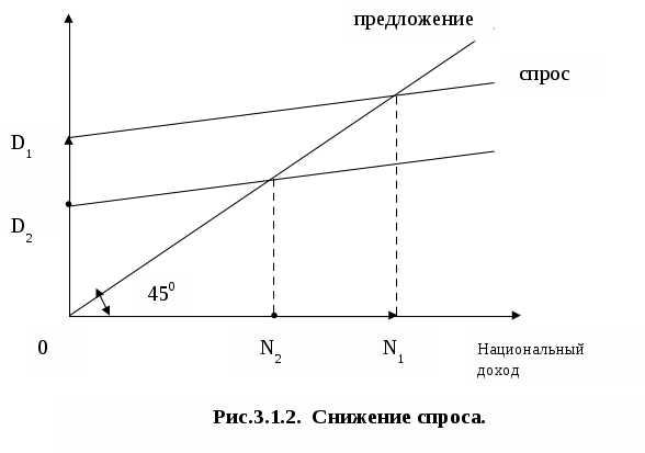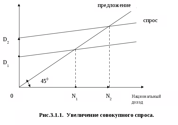 Рост спроса на величину D>1> D>2> вызывает рост национального дохода с ON>1> до ON>2> от уровня. Стрелкой на оси ординат показан сдвиг вверх линии совокупного спроса, стрела на оси абсцисс показывает увеличение национального дохода.