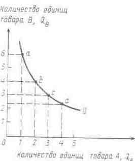 Потребитель безразличен к выбору между товарными наборами вдоль кривой и. Наборы а, Ь, с, с) доставляют ему одинаковое удовлетворение.