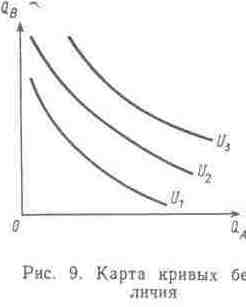 вой (т. е. при различных наборах) и имеет тенденцию уменьшаться. Чем больше товара А потребляет потребитель по отношению к товару В. тем от меньшего количества товара В он готов отказаться .в пользу А. Если по каким-то причинам потребитель может увеличить в наборе количество товаров Л и В, то общий уровень его удовлетворения повышается (кривая безразличия 'сдвигается вправо).