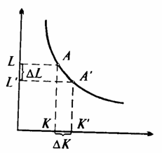 Замещение одних факторов производства другими не имеет абсолютного характера, поскольку каждый фактор делает то, что не может делать другой. Поэтому следовало бы говорить не о взаимозаменяемости, а, скорее, о взаимодополняемости факторов. Существует предельная норма технологического замещения факторов производства. Мы ограничимся рассмотрением процессов индустриализации производства, когда происходит замещение затрат ручного труда работой машин и механизмов. В этом случае предельной нормой технологического замещения физическим капиталом, т.е. машинами, называют величину труда, которую может заменить каждая единица работы машин, не вызывая при этом ни увеличения, ни уменьшения объема производства. Такую комбинацию двух факторов производства можно изобразить изоквантой. На рис.1 по оси абсцисс отложены часы работы машин (физического капитала К), а по оси ординат - затраты ручного труда. В каждой точке изокванты предельная норма технологического замещения равна наклону касательной в этой точке, умноженной на минус единицу, ибо уменьшение затрат труда требует увеличения работы машин. В нашем случае она будет равна - ΔL/ΔА
