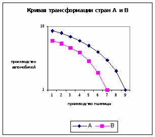 существующие в области производственных возможностей разных стран. Так, на рисунке 2 изображены кривые трансформации стран А и В Производственный потенциал страны А выше, чем у страны В. Даже. , если бы страна В решила полностью сосредоточиться на производстве точке Z>1>. Страна А, поставив аналогичную задачу, достигнет максимума только автомобилей, ее потенциал позволил бы ей достичь максимума в ресурсно-технического обеспечения в сфере автомобилестроения страны производства автомобилей в точке Z>2>, что объясняется превосходством А.