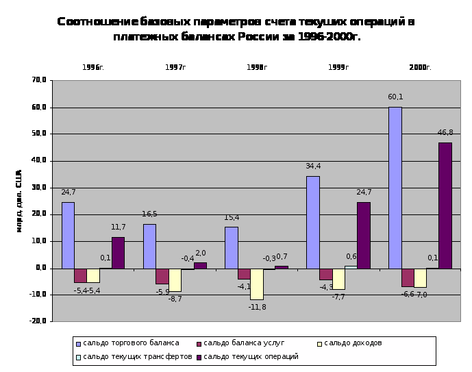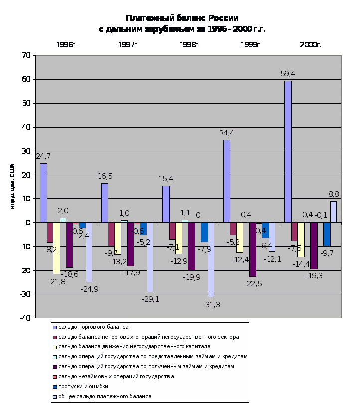 2000 год для платежного баланса России стал переломным. Впервые итоговое сальдо было положительным, впервые сальдо торгового баланса было таким большим, впервые было выплачено такая большая сумма по внешнему долгу. Да еще ряд примеров можно привести, что было в тот год впервые. В тот год нас пытались убедить, что в экономики России начался невиданный подъем. Но спустя годы можно сказать, что такого подъема не было, были только удачные стечения обстоятельств: повышение цен на нефть, списание части внешнего долга перед Лондонским клубом и т.д. И многие не верили в этот подъем: из России произошла большая утечка капиталов и не только официальным путем, и вкладывать в экономику инвесторы не хотели, как иностранные, так и отечественные.