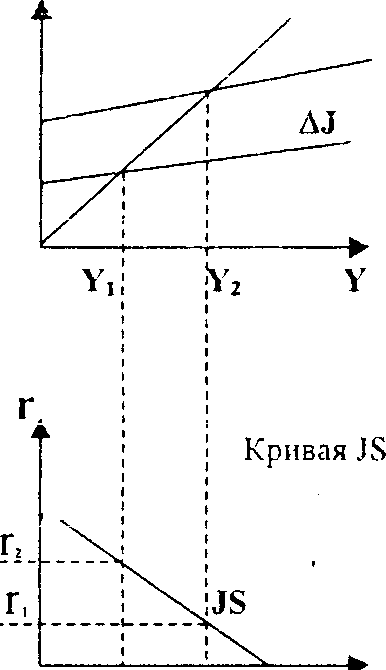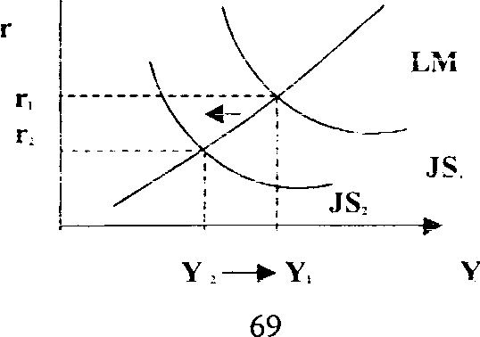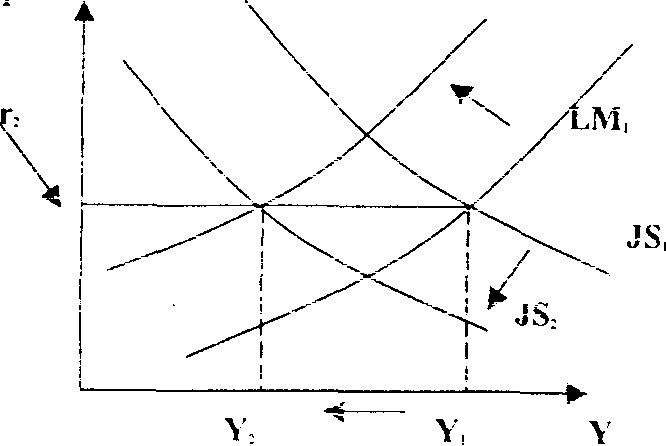 если Центробанк будет поддерживать неизменной процентную ставку г, то в ответ на рост налогов и сдвиг JS ( до уровня JS>2>). он должен уменьшить денежное предложение и это сдвигает LM влево(до уровня LM>2 >)
