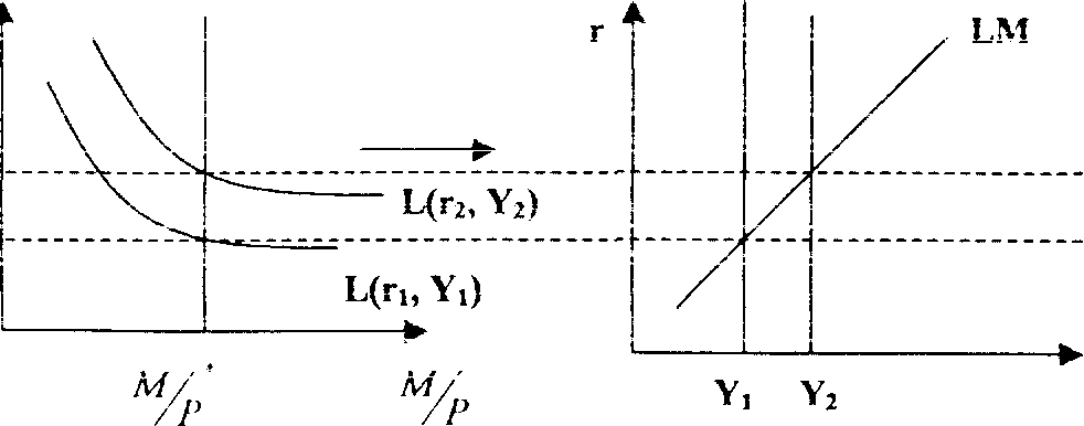 Если Центральный банк увеличивает денежную массу, то при неизменных целях растет денежное предложение(М/Р) , Кривая LM передвигается вправо(до LM:) и равновесие устанавливается при более