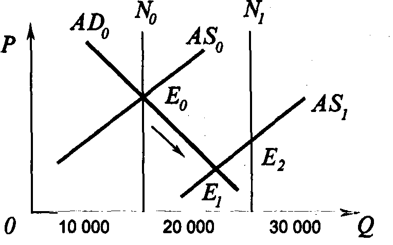 Предположим, что экономическая система первоначально находится в состоянии равновесия в точке Е>0> Затем уровень естественного реального объема производства поднимается с 15 000 до 25 000 денежных единиц. Это представлено на рис. 2 сдвигом кривой совокупного предложения на долгосрочном временном интервале из положения N>0> в положение N>1>. Кривая краткосрочного совокупного предложения также сдвинется и займет положение AS>1>. Допустим, что совокупный спрос при этом не изменится (например, в силу проведения жесткой денежно-кредитной, налоговой и бюджетной политики государства), т. е. кривая совокупного спроса останется в положении AD>0> Что будет в этом случае происходить с экономической системой? Прежде всего произойдет незапланированное увеличение товарно-материальных запасов у производителей. Следовательно, предприниматели не смогут полностью реализовать увеличивающийся объем производства по тем ценам, которые сложились прежде. Чтобы избежать накопления запасов нереализованной продукции, они вынуждены будут снижать уровень цен, надеясь таким образом стимулировать сбыт. В то же время они будут изменять свои производственные планы, несколько сокращая объем производства, перемещаясь из точки Е>2> в Е>1> вдоль кривой краткосрочного совокупного предложения AS>1>. В ответ на это потребители будут перемещать объем своих покупок вдоль кривой совокупного спроса из Е>0> в Е>1>. В итоге установится равновесие при неполной занятости, уровень безработицы возрастет, а экономика не сможет реализовать имеющийся потенциал экономического роста.