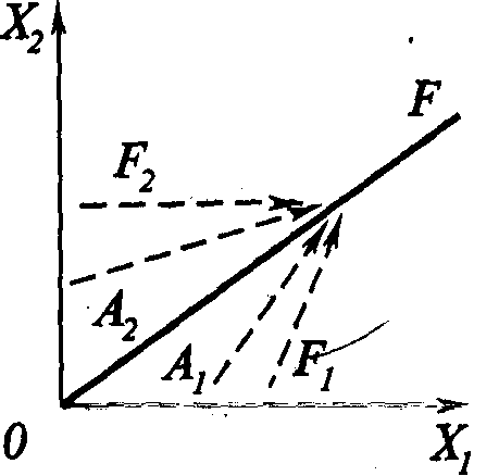 Все реальные траектории системы, отмеченные на. рис. 4, сходятся (по направлению стрелок) к траектории долгосрочного равновесия OF. Это означает, что даже при исходном довольно существенном отклонении экономической системы от состояния долгосрочного равновесия (точки А>1>, А>2>) выпуски продукции двух секторов постепенно приближаются к состоянию долгосрочного равновесия (точки близкой сходимости F>1>,F>2> Таким образом, данная система имеет траекторию устойчивого долгосрочного равновесия. Напротив, для системы, изображенной на рис. 18.5, характерно неустойчивое равновесие, поскольку, начиная движение из любой точки, не расположенной непосредственно на луче OF, эта система при движении по любой реальной траектории, обозначенной стрелками, будет постепенно удаляться от траектории равновесия.