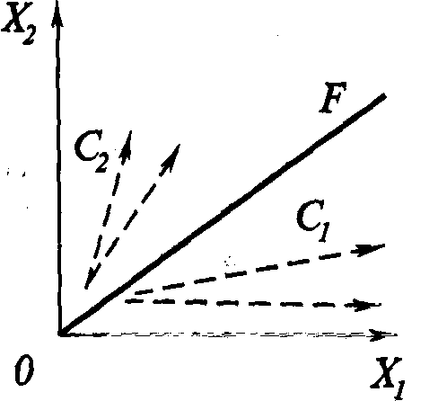Для иллюстрации понятий устойчивых и неустойчивых равновесных траекторий рассмотрим графическое описание двух очень простых динамических систем (рис. 4, 5). В каждой из этих систем производятся два типа товаров: товары потребительского назначения (У.) и товары инвестиционного назначения (X,). Фактическое состояние каждой из таких систем в любой заданный момент времени может быть представлено на графике одной точкой, координаты которой по оси абсцисс соответствуют объему выпуска потребительских товаров, а по оси ординат – объему выпуска инвестиционных товаров. Допустим, что прямой луч OF для каждой из систем характеризует долгосрочную равновесную траекторию развития. Любая точка этой траектории отражает состояние, при котором достигается равновесие между спросом и предложением на данные виды товаров и услуг. Изменения объемов выпуска, характеризующие прошлое и будущее развитие системы, описываются траекториями, отмеченными стрелками, указывающими направление движения системы во времени вдоль равновесной траектории.