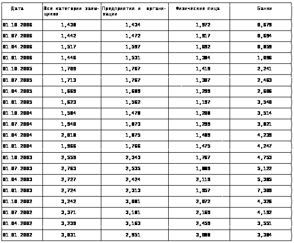 На первый взгляд проблема возникновения кризиса проблемных кредитов в российской банковской системе кажется сегодня не вполне актуальной. Действительно, период после экономического кризиса 1998 г. характеризуется практически непрерывным снижением доли просроченной задолженности в общем объеме ссудной задолженности (Приложение 1). Так, по состоянию на 1 января 2002 г. доля просроченной задолженности составила 3,03%, а на 1 октября 2006 г. - 1,44%. Данный показатель позволяет оценить кредитный риск российского банковского сектора как умеренный, так как согласно международной практике критической величиной является уровень 10%.