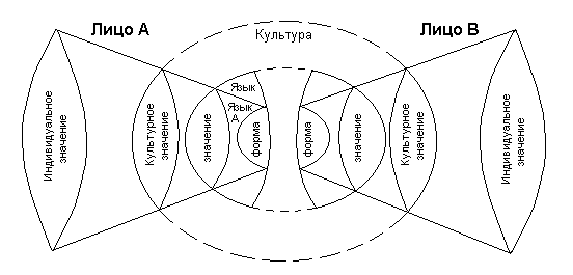 Однако надо сказать, что впервые связь языка и культуры, окружающей индивидов, была отмечена в схеме американского лингвиста начала века Ладо. В его схеме, отражающей процесс общения между Лицом А и Лицом В, показано, какие стадии и в какой форме должна пройти мысль от одного собеседника к другому.