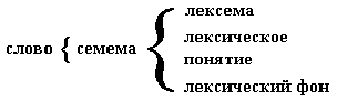 Однако наиболее сложным и интересным является случай фоновой лексики, то есть такой где слова эквивалентные в понятийной области, расходятся в другой сфере своей семантики. Рассматривая значение слова расчлененно, как совокупность семантических составляющих или семантических долей, можно выделить лексический фон следующим образом: он будет состоять из тех непонятийных семантических долей, которые образуют остаток, если из всей семантики, всего плана содержания слова (семемы) вычесть понятийные семантические доли.