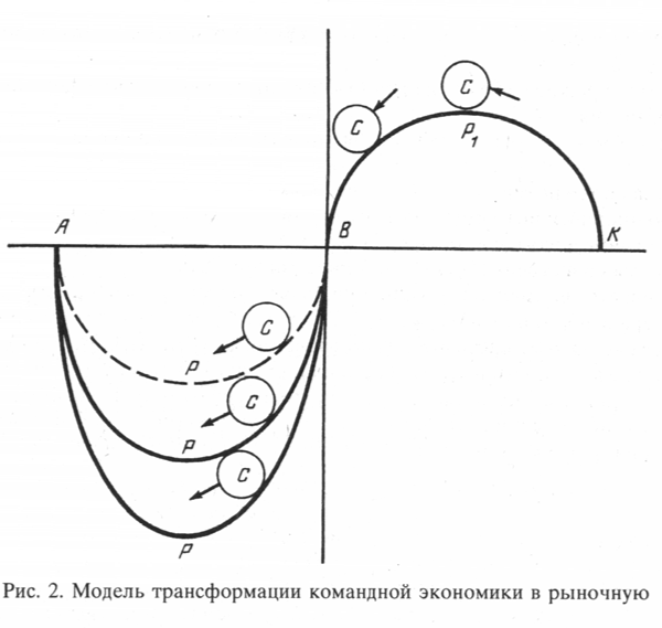 Трансформацию одной экономической системы в другую обозначает линия АВК (см. рисунок 1). Эта линия являет собой предел альтернативности, который можно переступить, лишь необратимо нарушив соответствующее всеобщее равновесие в точке Р или Р]. Эти равновесные состояния можно нарушить, во-первых, исключительно политическими средствами: